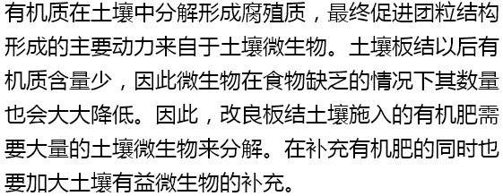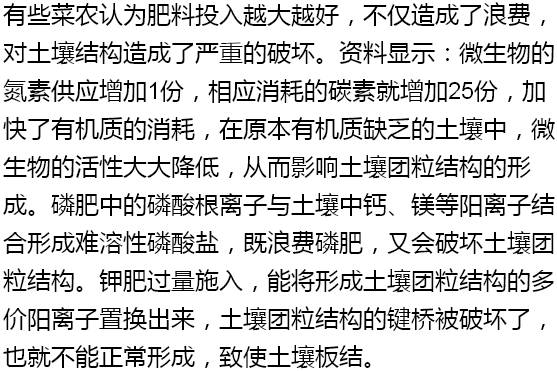 土壤板结的原因有四 先来了解下什么是土壤板结? 土壤板结是因土壤耕作层缺乏有机质,结构不良,在某些外力作用下(如灌水、降雨、镇压等)结构遭破坏,干燥后受内聚力作用使土面变硬,最终不适于作物生长的现象。而导致土壤板结的因素主要集中在以下四个方面。 第一,土质本身的原因。 粘土中的粘粒含量大,土壤中毛细管孔隙较少,通气、透水较差,下雨或灌水以后,容易堵塞孔隙,造成土壤板结。 第二,有机质补充不足。 土壤中有机物质补充不足,腐殖质含量偏低,影响微生物的活性,从而影响土壤团粒结构的形成,使得土壤的酸碱变化明显,导致土壤板结。 第三,长期或单一地偏施化学肥料。 第四,地膜等清理不干净,在土壤中形成有害的块状物;频繁地镇压以及翻耕过于精细等破坏土壤结构;使用被污染地下水或工业废水灌溉等都会造成土壤板结。 改土前先改施肥意识和产品结构 虽然说改良的是土壤,但最需要改变的还是菜农的护土意识和用肥习惯。其实在修复土壤时,选择合理的产品可以快速解决土壤的一些问题,但是若菜农仍然按照老的施肥思路和用肥方式,那么改土成效必然会大打折扣。在此提醒,要想改善土壤的板结盐渍化问题,须严格按照以下措施进行。 首要的当然是重视优质有机肥的使用。 腐殖质是形成团粒结构的主要成分,而腐殖质主要是依靠土壤微生物分解有机质得来的。因此,向土壤补充足量的有机质可以大大提高团粒结构的数量。在使用底肥的时候,就应加大优质有机肥的用量。比如粉碎的秸秆、玉米芯、花生壳等等,禽畜粪肥中牛羊粪有机质含量高,是改良土壤板结的首选。而鸡鸭猪粪其含水量大,氮含量较高,可以使用但用量不能太大。目前市场上一些优秀的有机肥产品也是改良土壤板结不可缺少的一种选择。 次要的是加大有益菌的投入。 再一个必须要说的是化学肥料合理使用。 最后要说的是调整产品结构。 目前高利用率的水溶性肥料产品很多,促进吸收的功能性产品也很多,因此在蔬菜栽培时,做好提升有机质这个基础条件外,尽量少用利用率低的普通复合肥,使用高品质水溶肥,也能够避免土壤板结和盐渍化,从而提高或延长土壤的使用寿命。